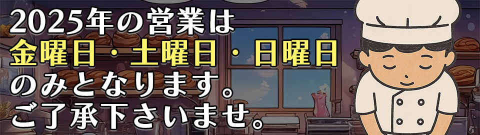 2025年の営業日は毎週金曜日、土曜日、日曜日の3日間となります。ご了承くださいませ。