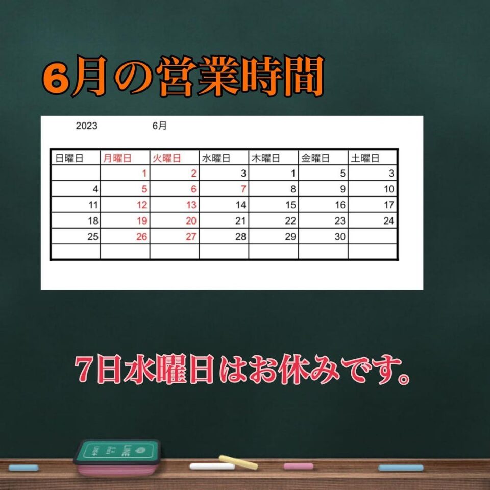 6月は7日(水曜日)にお休みを頂きます!それ以外は通常通りの営業ですので、雨にも負けずご来店下さいませ!