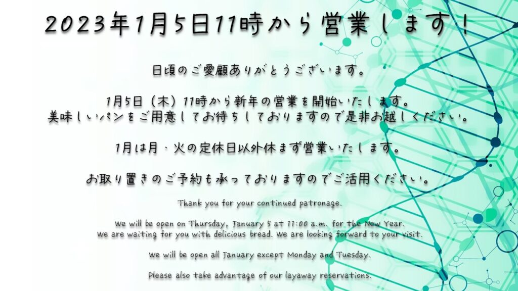 本日から新年の営業を開始します! 2023年1月5日 最終更新日時 : 2023年1月4日 allemandehiro 本日から営業します! 11時から新年の営業開始です!みなさまのお越しをお待ちしています!